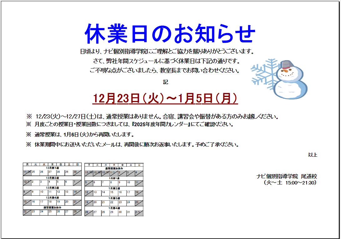 12月28日(日)~1月5日(月)まで冬期休業となります。