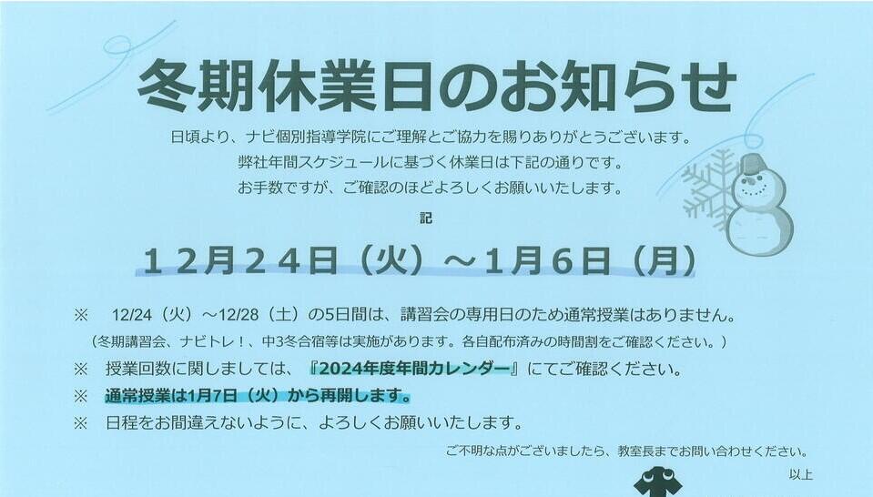 12/29(日)~1/6(月)までは冬期休業とさせていただきます。
