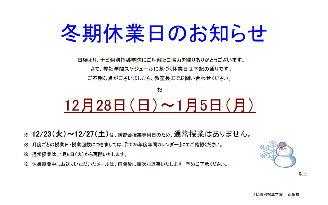 ※12月23日(火)~12月27日(土)は、講習会授業専用日のため通常授業はありません。