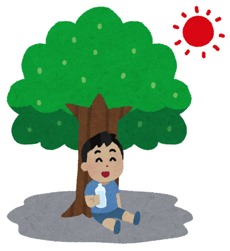 ぼうしをかぶったり、日傘をさしたりしつつ、また日かげで活動したりすると暑さが幾分和らぎます。