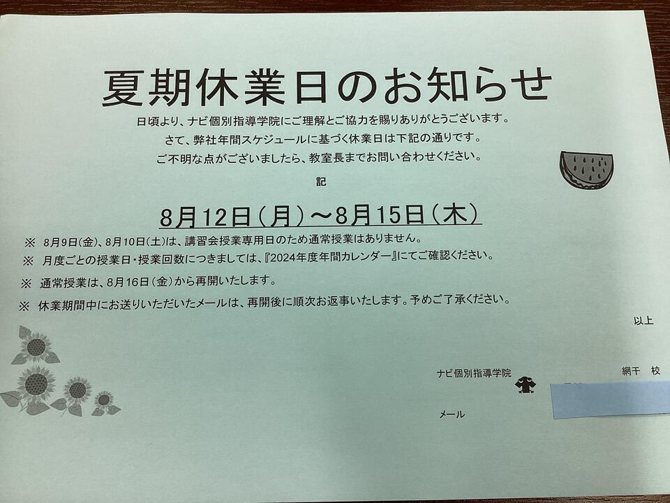 各 生徒には今週の授業時に『夏季休業のお知らせ』の