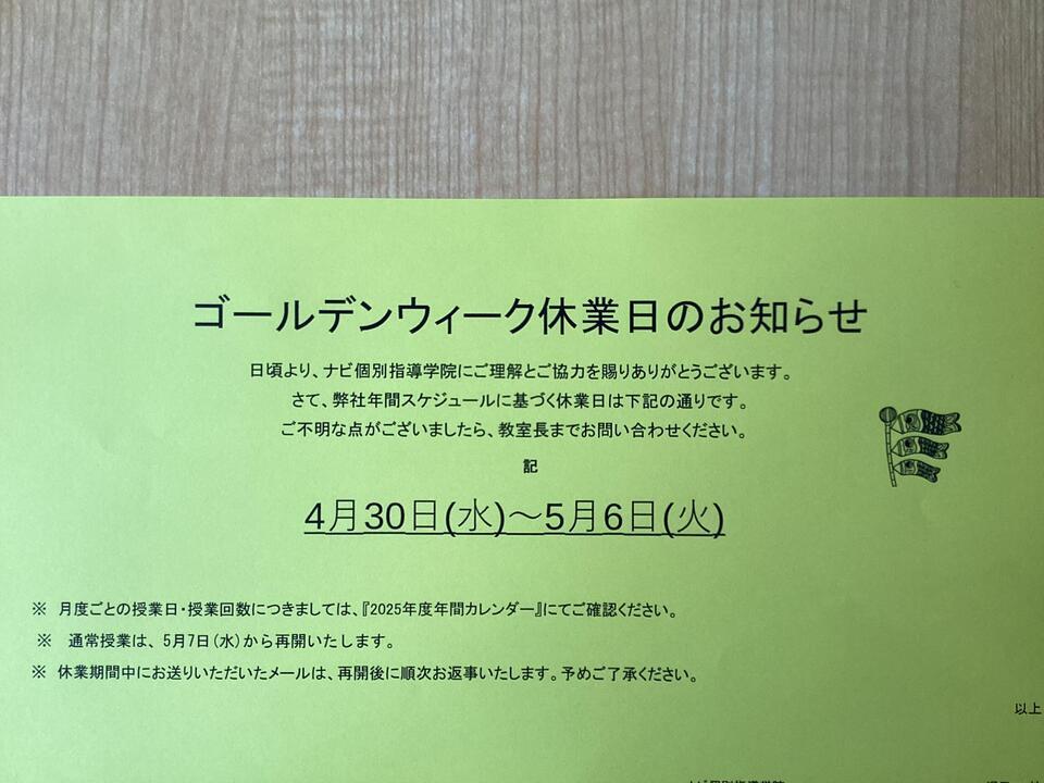 休み明けは5/7(水)からになりますので よろしく お願いします。