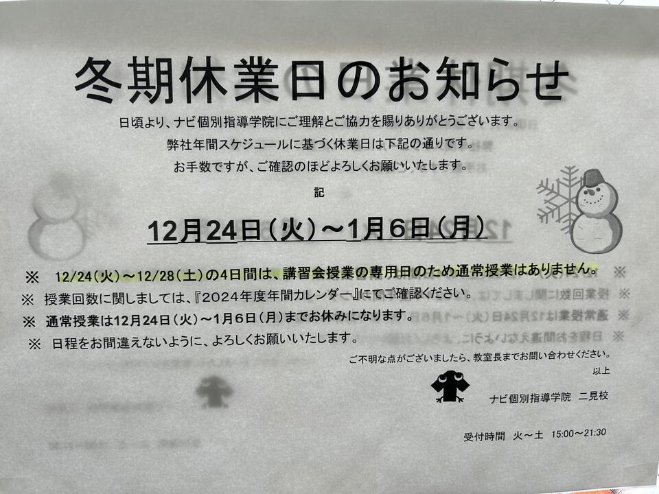 ※12月24日(火)~12月28日(土)の5日間は、講習会専用日のため通常授業はございません。