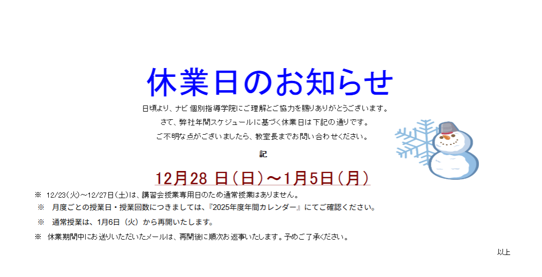 日頃より、ナビ個別指導学院にご理解とご協力を賜りありがとう