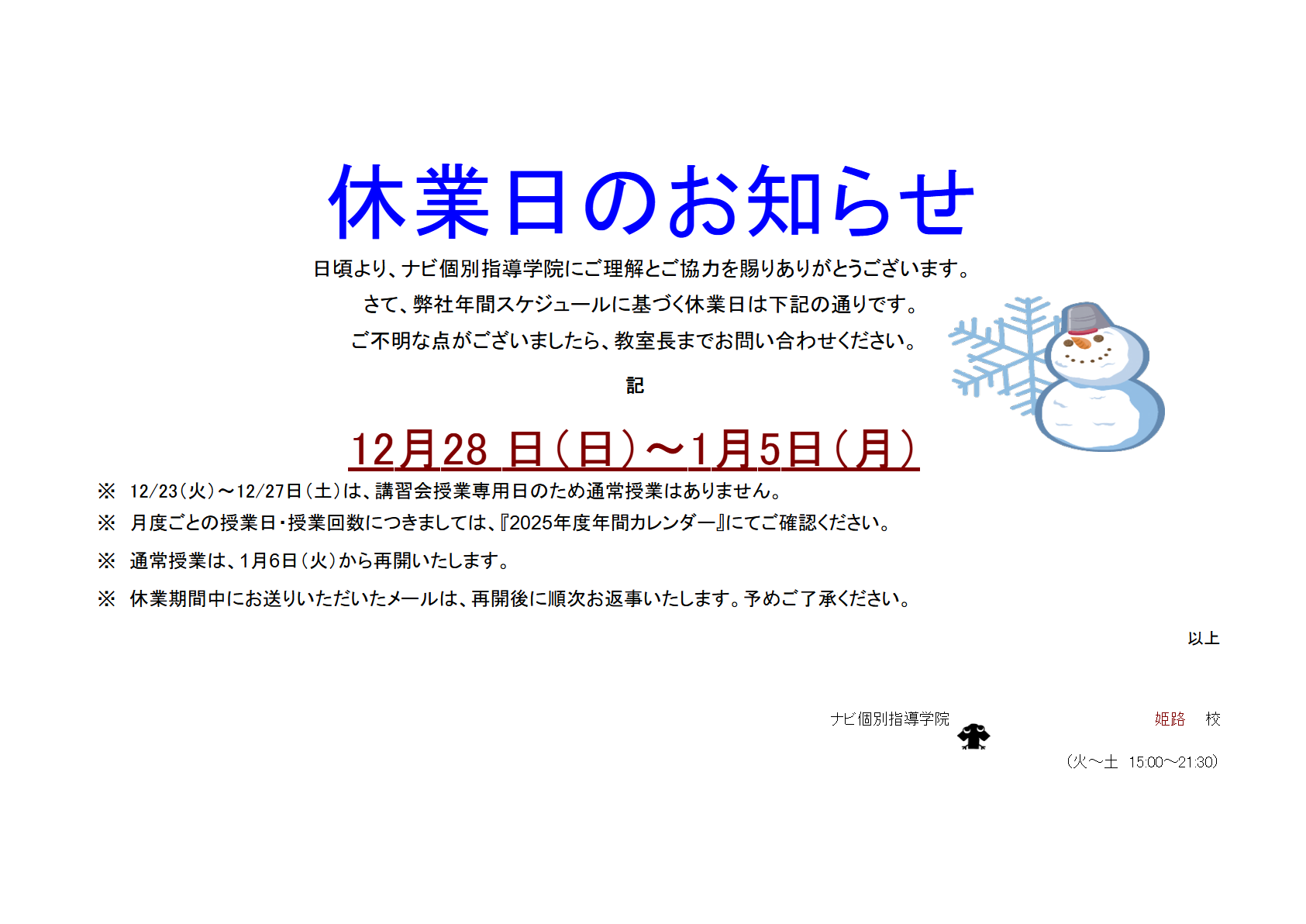 さてナビ個別指導学院では、年末年始のお休みをいただいております。