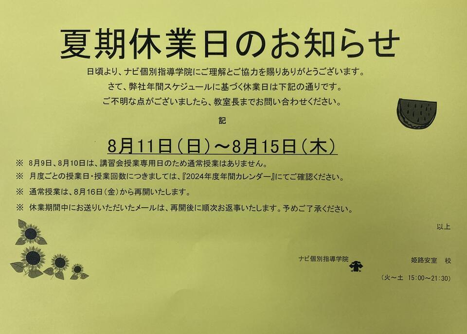 今年度の夏期休業日は、8/11(日)~8/15(木)となります。