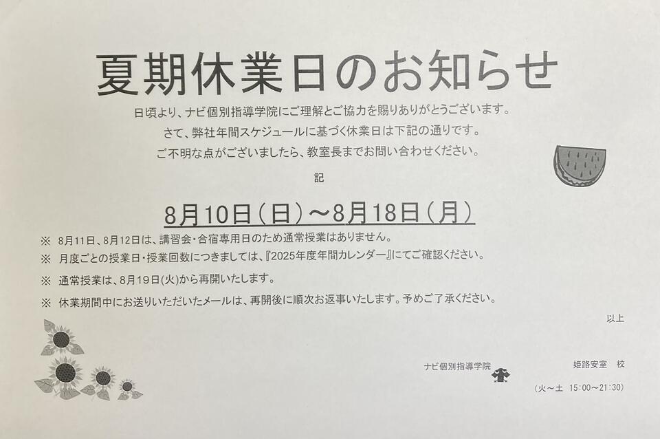 今年度の夏期休業日は、8/10(日)~8/18(月)となります。