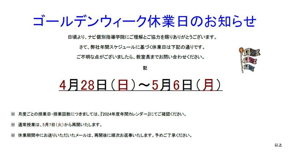 お休み期間中にいただいたお問い合わせについては5/7(火)以降にご返答させていただきます。