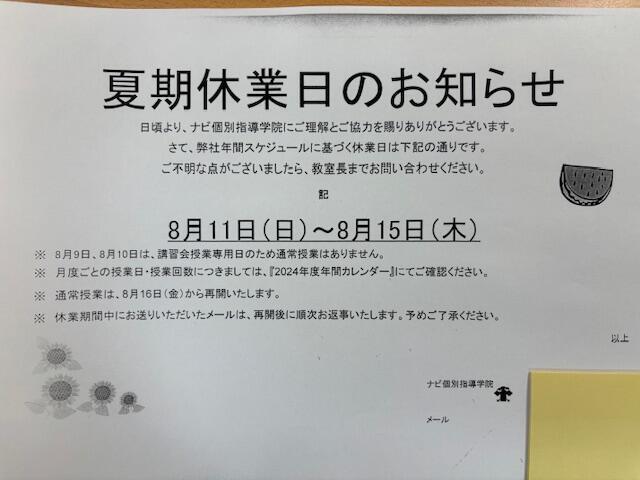 ☆8/9(金)、8/10(土)は講習会専用日のため、通常授業はありません。