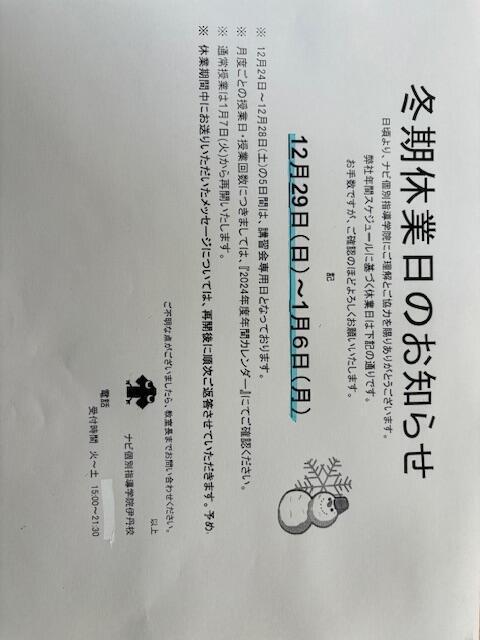 12/24(火)~12/28(土)は通常授業はお休みとなっております。