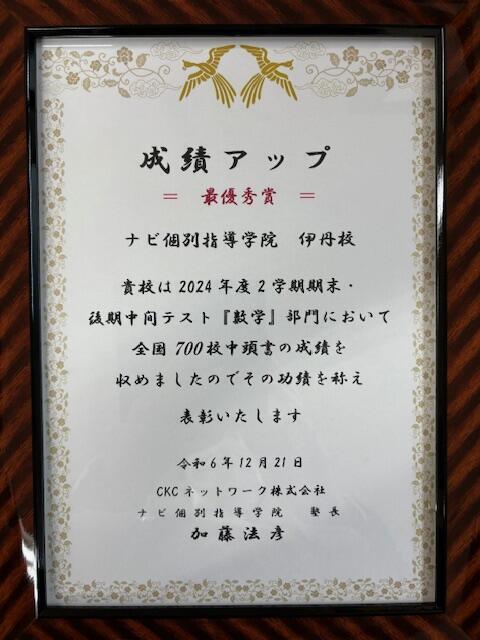 成績アップ 2学期期末テスト 数学部門 最優秀賞 として