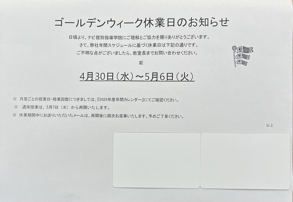 先週も何度かこちらのブログでお伝えしましたし塾生の皆様には専用アプリeナビですでにお知らせしてますが、4月30日(水)~5月6日(火)は、ゴールデンウィーク休業をいただきます。