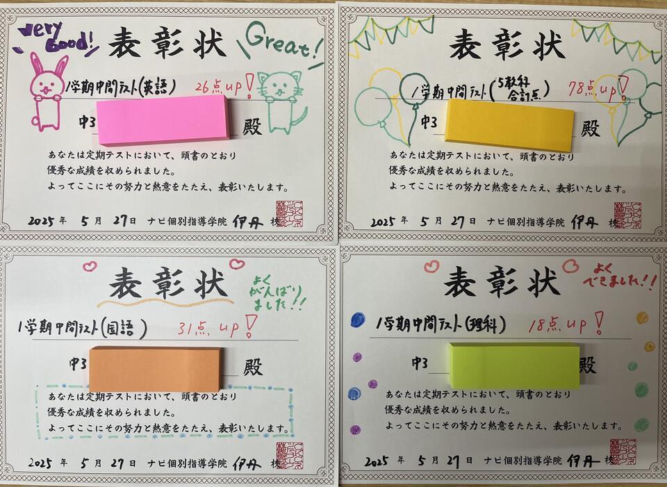 昨日に続いて先日の中学生の中間テストで嬉しい結果の出た生徒さんを一部紹介させて頂きます。