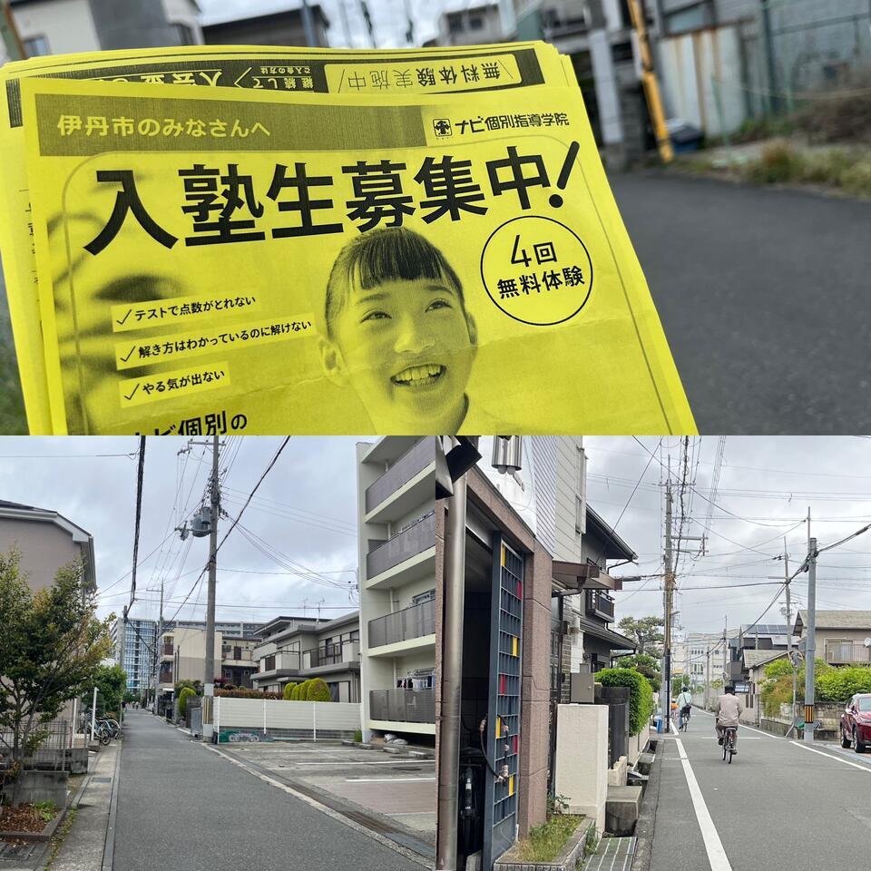 本日の午前中は伊丹市行基町付近で、小中高生対象の無料体験授業のチラシ等を配らせて頂きました。