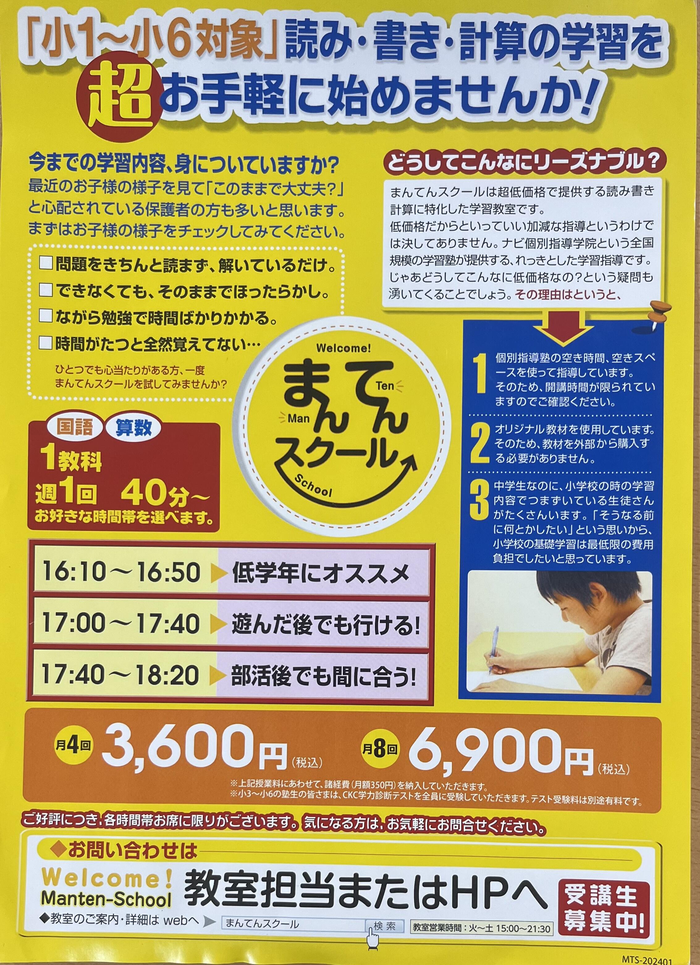 特に小学校低学年の生徒さんで勉強にご不安のある保護者様、何をすればいいか分からないわと言われる保護者様、まずは「まんてんスクール」を始めてみませんか?