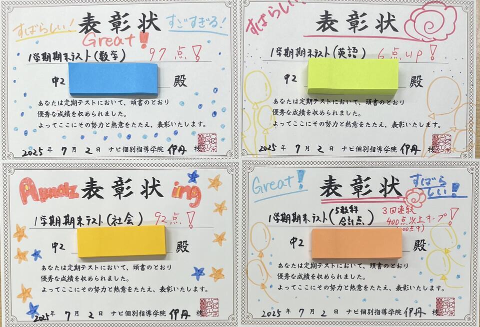 火曜日に続きまして、期末テストで嬉しい結果が出た生徒さんを一部紹介させて頂きます。