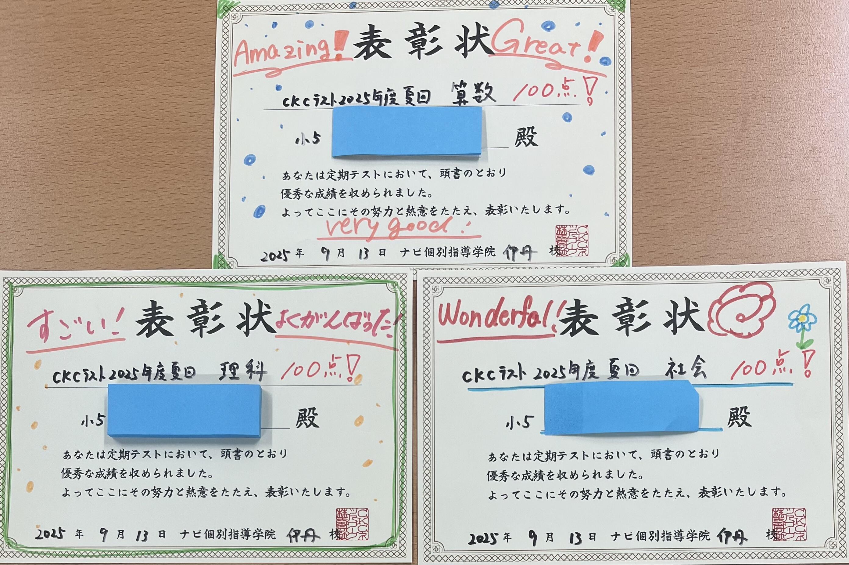 今回、算数と理科と社会がな、な、何とそれぞれ100点! おめでとう!!!