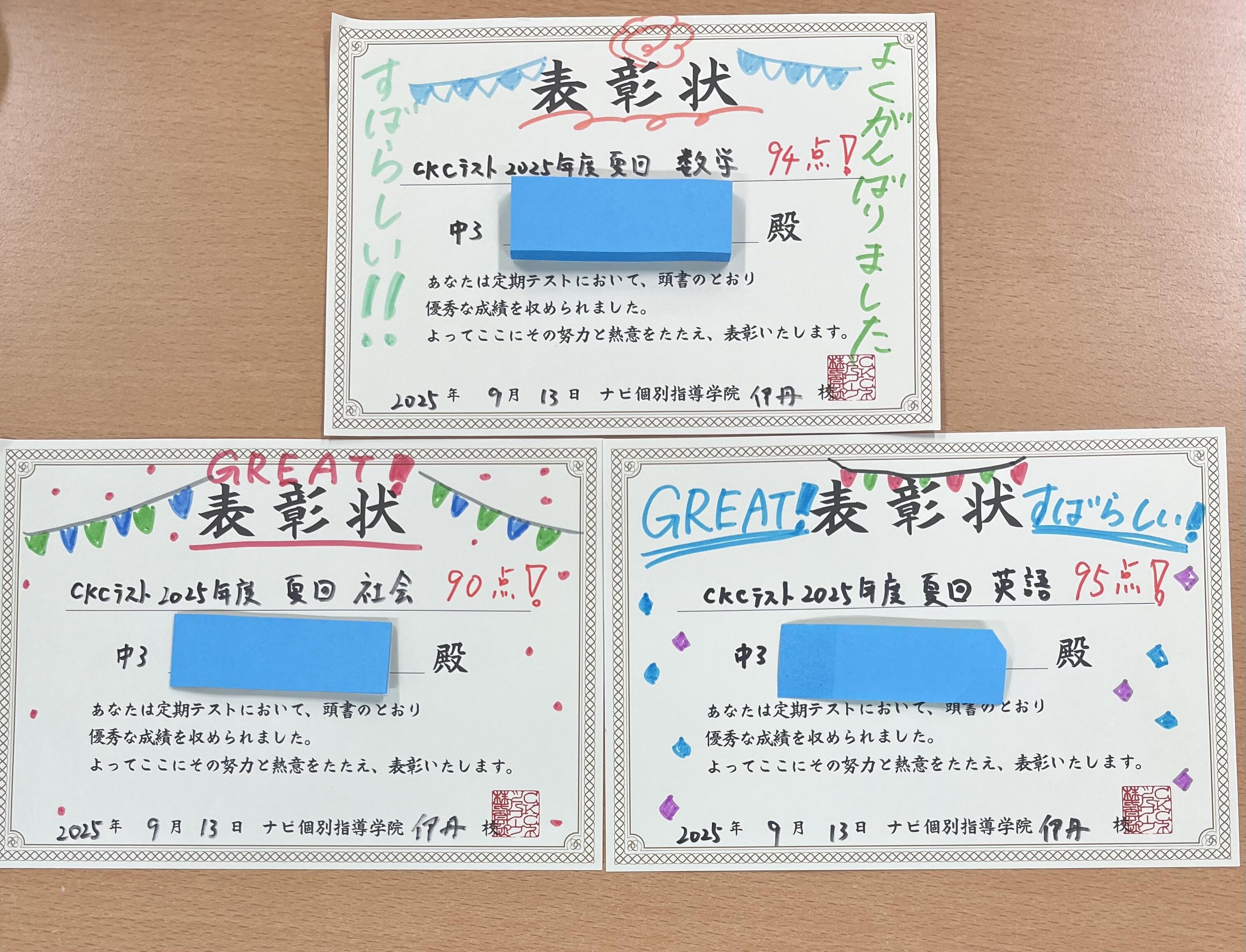 中学3年生、H君 数学が94点!英語が95点!社会が90点!
