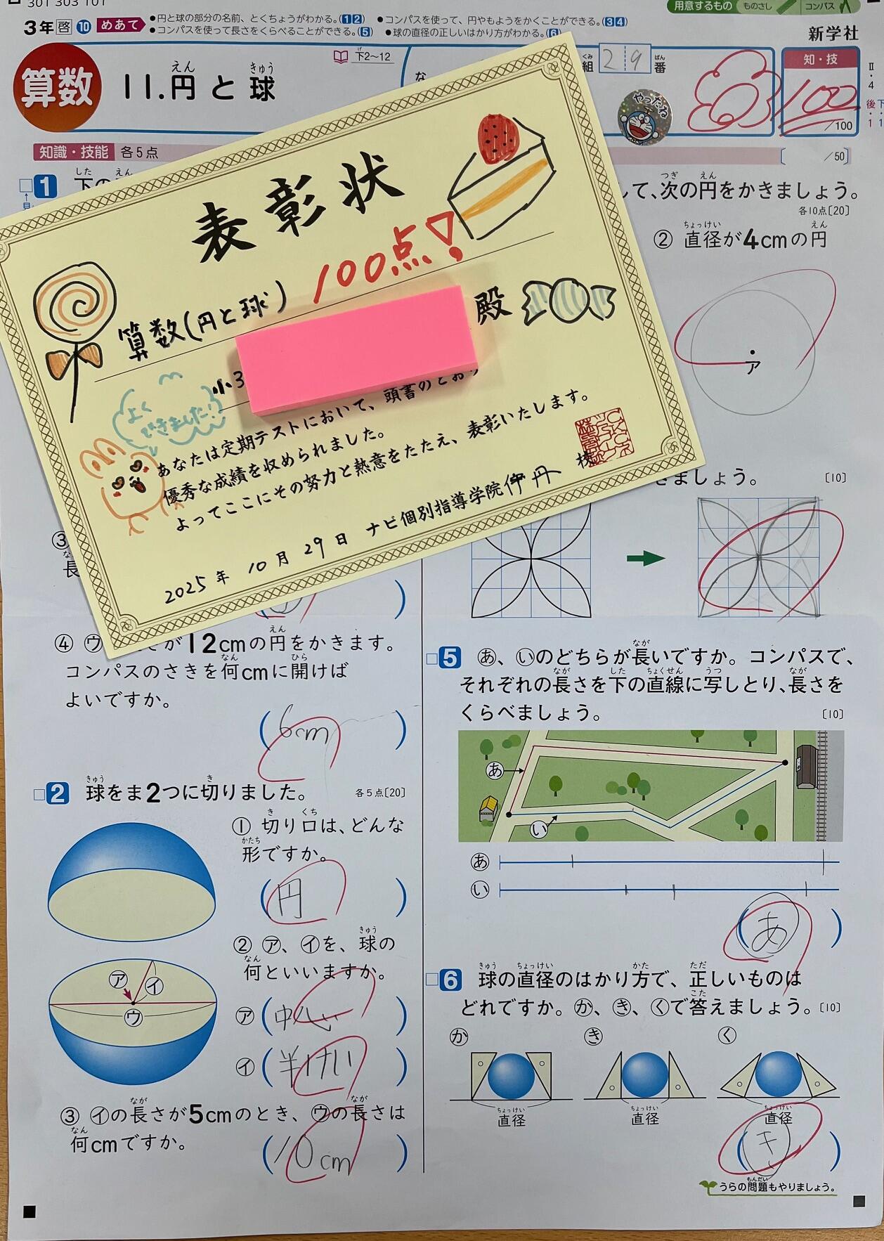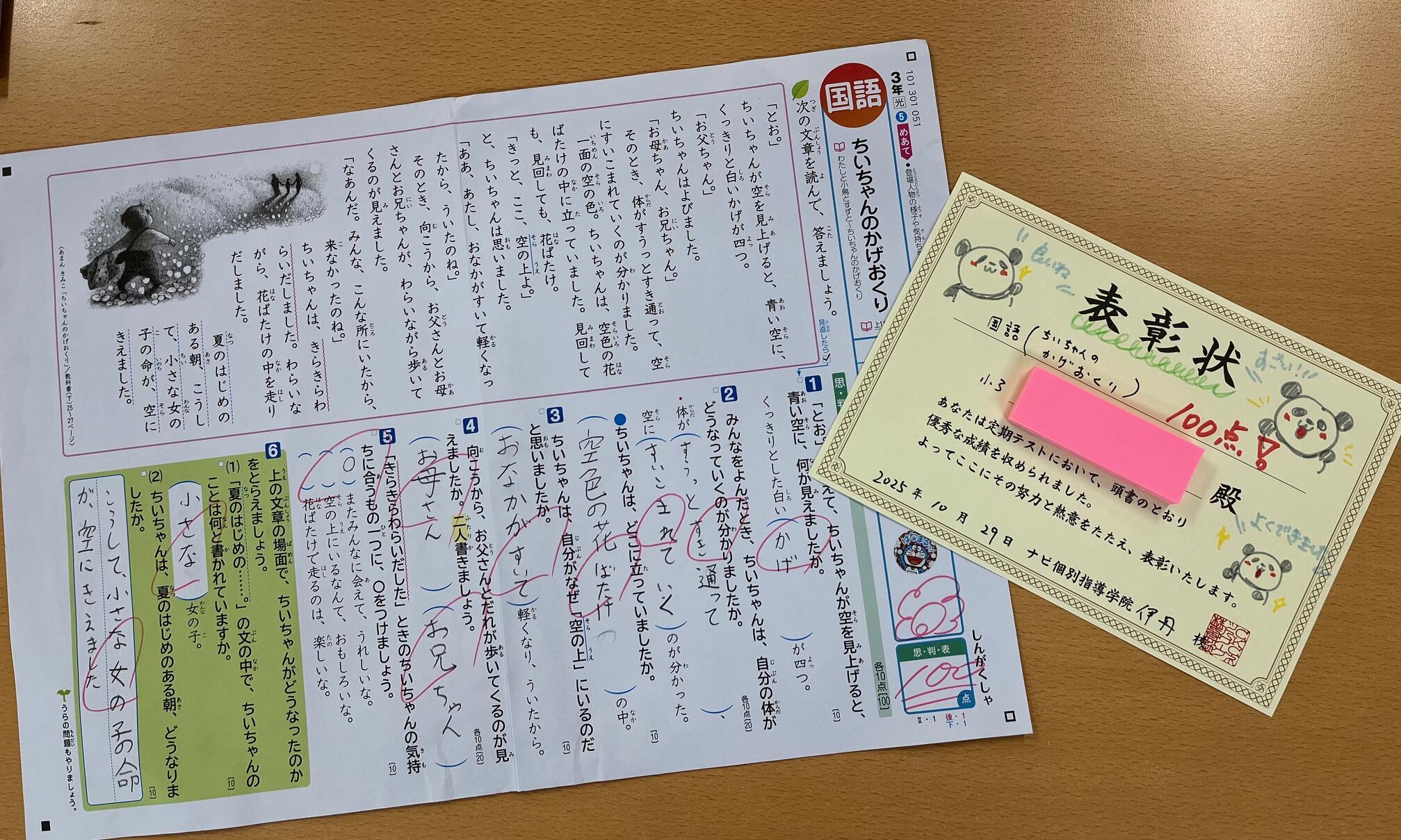 塾生以外の小学生さんにも、当教室の自習室に1週間の間に2回以上来て勉強して頂いて、その後学校で受けたテストが、もし100点が取れた場合、そのテストを同じように持参していだだければ、塾生と同じように表彰状をお渡しさせて頂いてます! 教科は、算数、国語、理科、社会なら、どの教科でも大丈夫です。