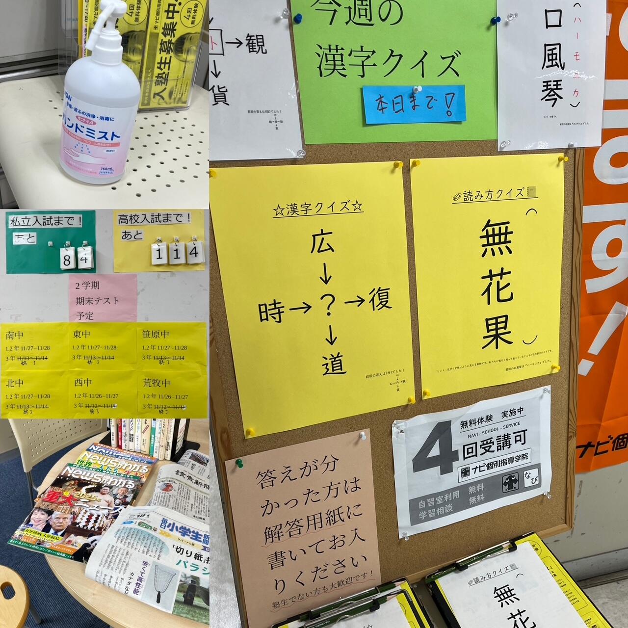 西中•荒牧中の1.2年生の皆さんは明日19日水曜日には期末テスト1週間前に突入しますし、南中、東中、笹原中、北中の1.2年生も、明後日20日木曜日には同じく1週間前に突入します!