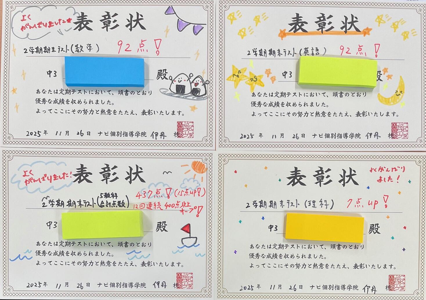 そんななか、期末テストで嬉しい結果のお知らせが先週から入ってますので一部紹介させて頂きます。