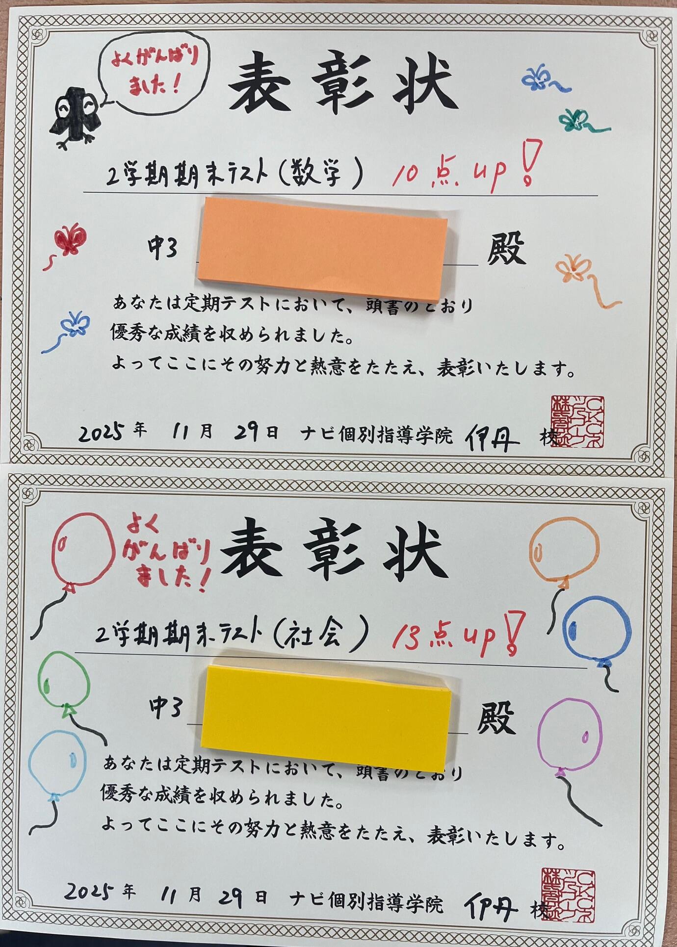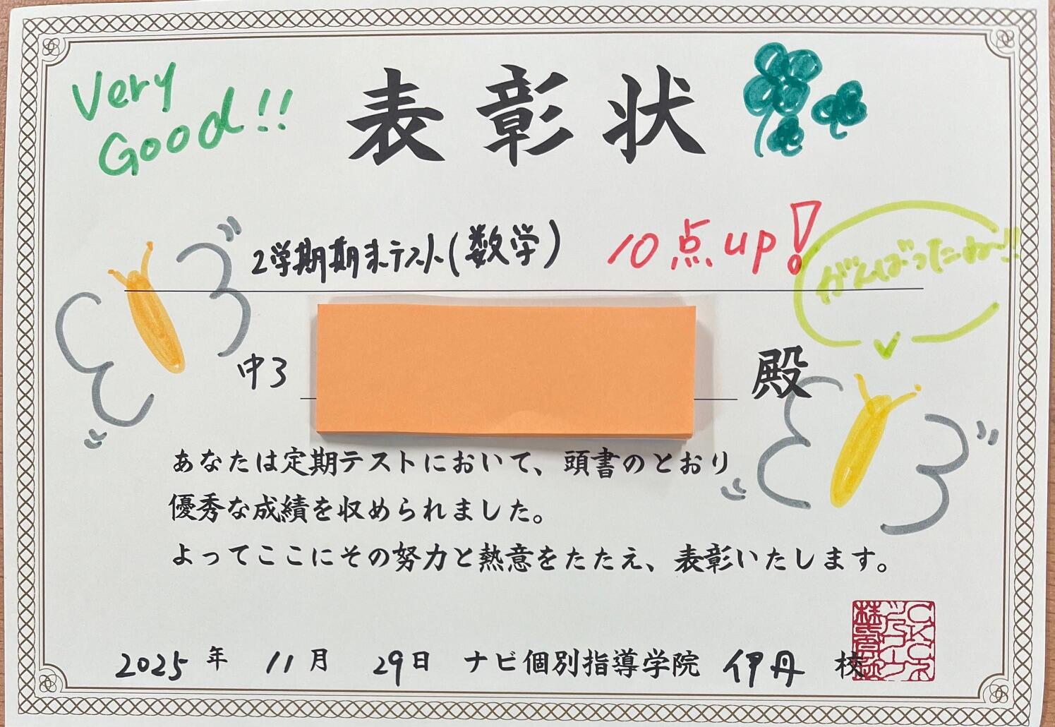 昨日に続いて期末テストで嬉しい結果の出た生徒さんを一部紹介させて頂きます。
