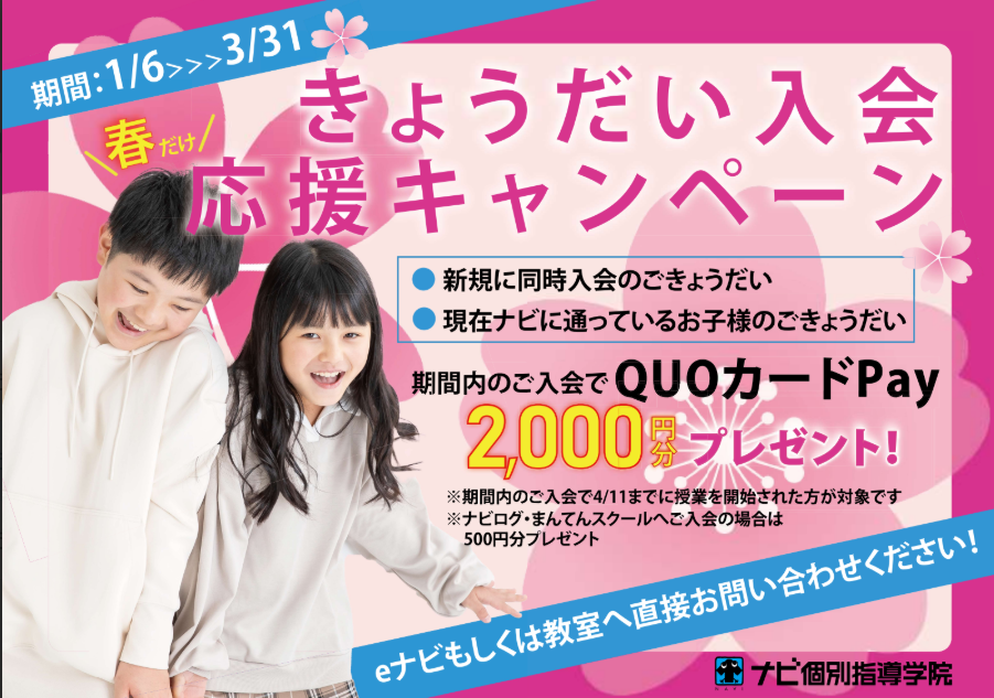 現在既にこちらの塾に通われてる皆様あるいはこれから入塾をされる皆様問わず、もしご兄弟やご姉妹が一緒に(同時に)入塾される場合、お二人目のお子様の入塾も応援するために2,000円分のQUOカードPayをプレゼントいたします!