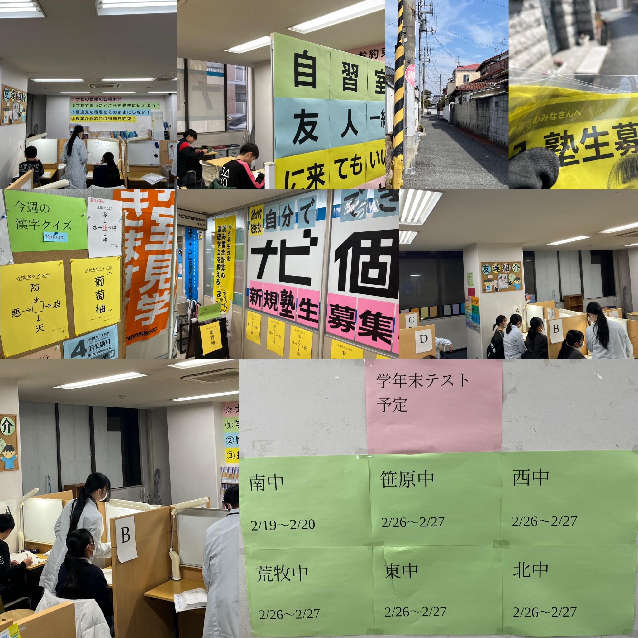 西中・東中・北中・笹原中・荒牧中の1.2年生も来週2/19木曜日には同じく期末テスト1週間前に突入します。