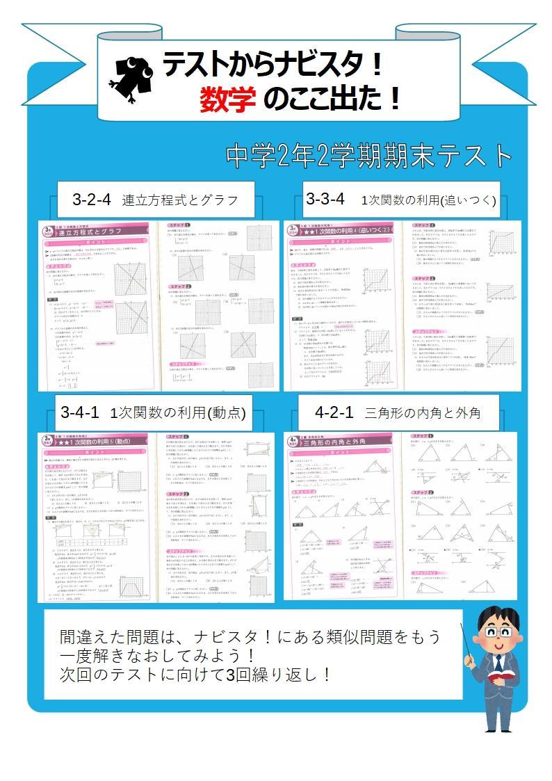今回も ナビ個別の自社教材「ナビスタ!」と近隣中学校の2学期期末テストの