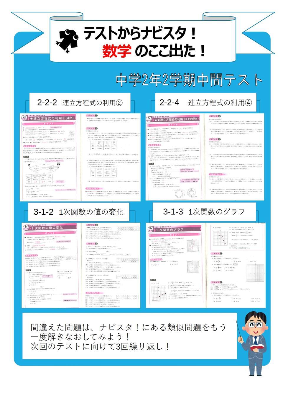 今回も ナビ個別の自社教材「ナビスタ!」と近隣中学校の中間テストの