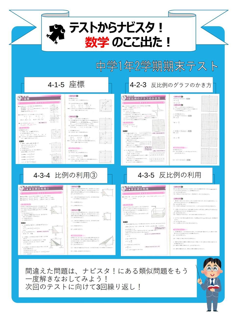 今回も ナビ個別の自社教材「ナビスタ!」と近隣中学校の期末テストの