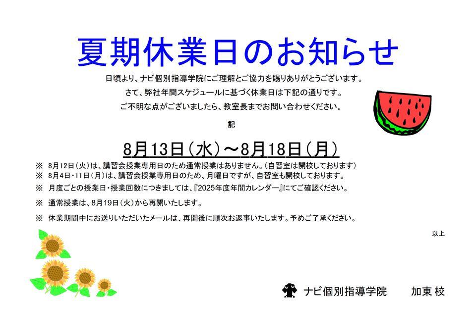 また、8月11日・12日についても通常授業はありません。