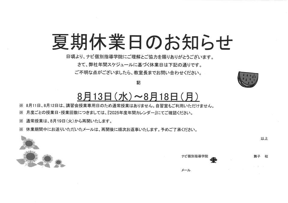 この期間はお休みになりますので、無料体験の新規受付、通常授業、夏期講習、自習室利用は