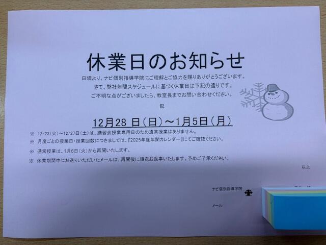 ☆12/23(火)~12/27(土)は講習会専用日のため、