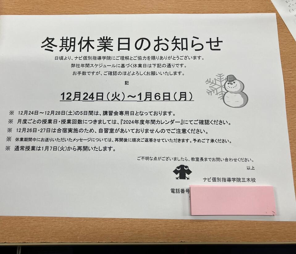 こんにちは!ナビ個別指導学院三木校です!冬期休業のお知らせになります。12/24(火)~1/6(月)は冬期休業期間となっております。1/7(火)スタートになりますのでよろしくお願いいたします。今年もありがとうございました。来年もどうぞよろしくお願いいたします。