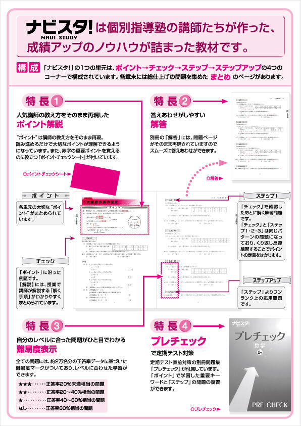 小学生の算数と中学生には自社で作ったテキスト「ナビスタ!」を提案させていただいています!
