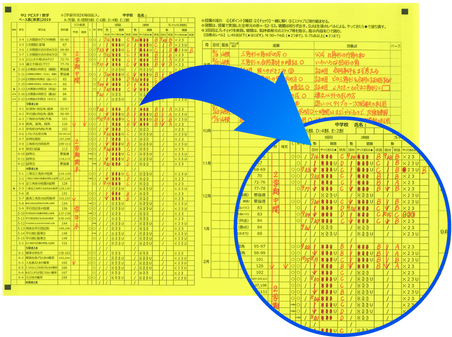 また、通常授業では、オリジナルテキスト「ナビスタ!」を使いペース表にそって最低3回は単元の問題を解き理解を深めて反復学習をしています。