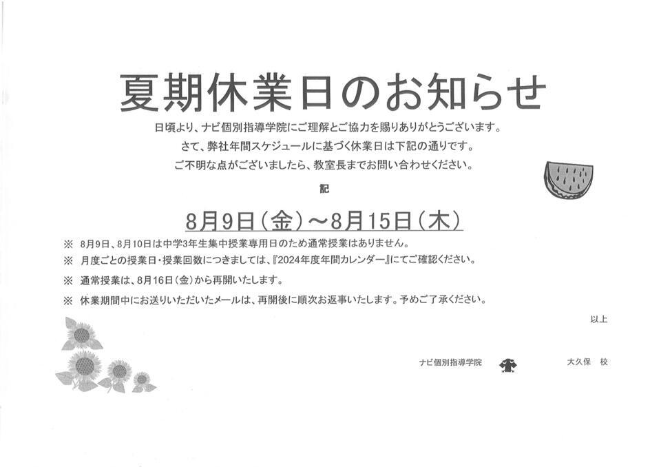 8月9日(金)~8月15日(木)の間、ナビはお盆休みになります。