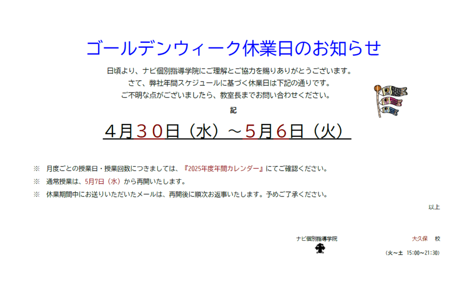 明日4月30日(水)から5月6日(火)までゴールデンウィーク休業に入ります。