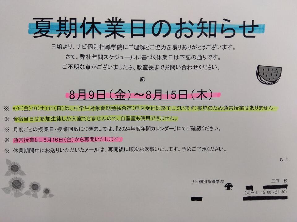 ナビ三田校は8/9(金)~15(木)まで夏期休業となります。