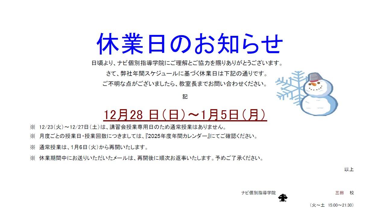 ※詳しくは教室からお渡ししている「冬期休業日のお知らせ」
