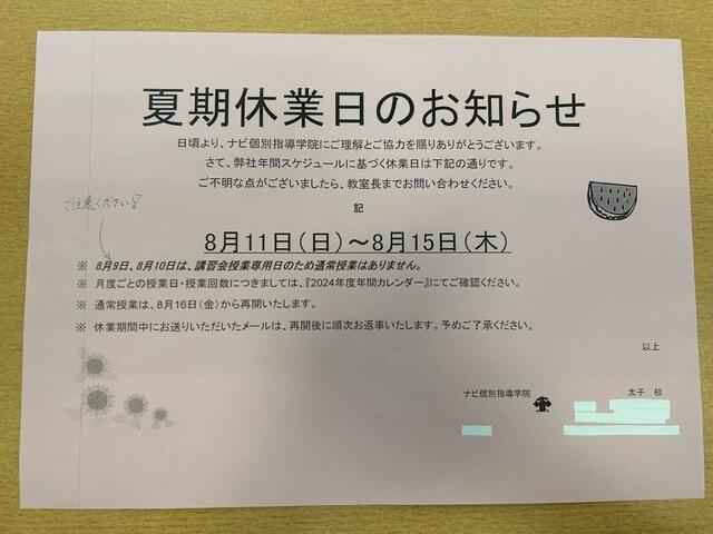 龍野・網干・太子地域にお住いの皆さんこんにちは!ナビ個別指導学院太子校の阪井です。写真の期間の8/11(日)~8/15(木)までは夏期休業期間となっておりますのでご注意ください!熱中症には気を付けましょう!!!