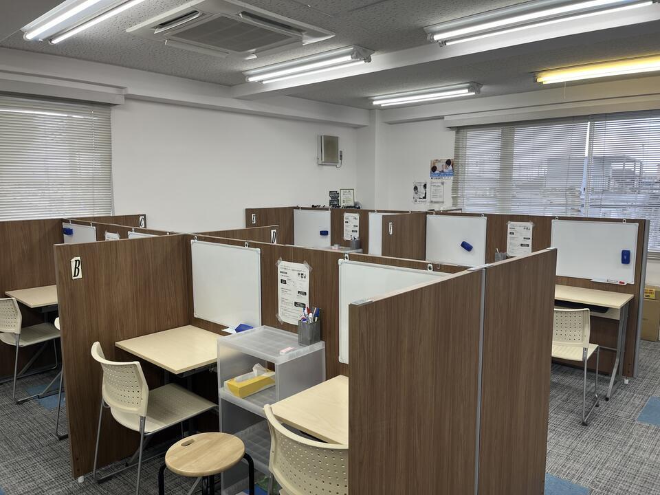 ナビ個別指導学院の授業は、個別の席ごとに設置された自分専用のホワイトボードで解き方や考え方を一緒に確認、それから生徒が問題を解くという「個別授業」スタイルです。