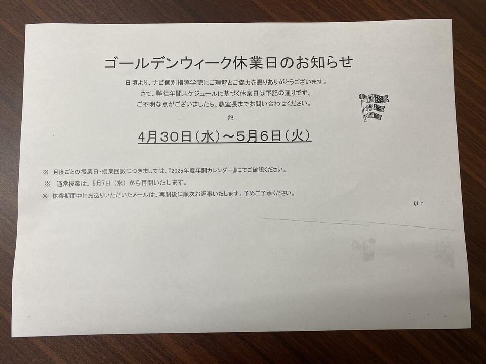 ※4/29(火)は通常授業がございますのでご注意ください。