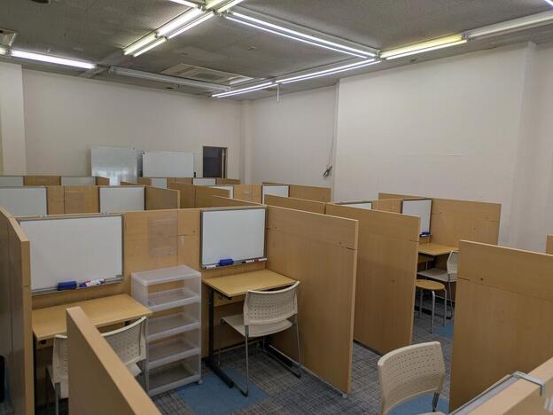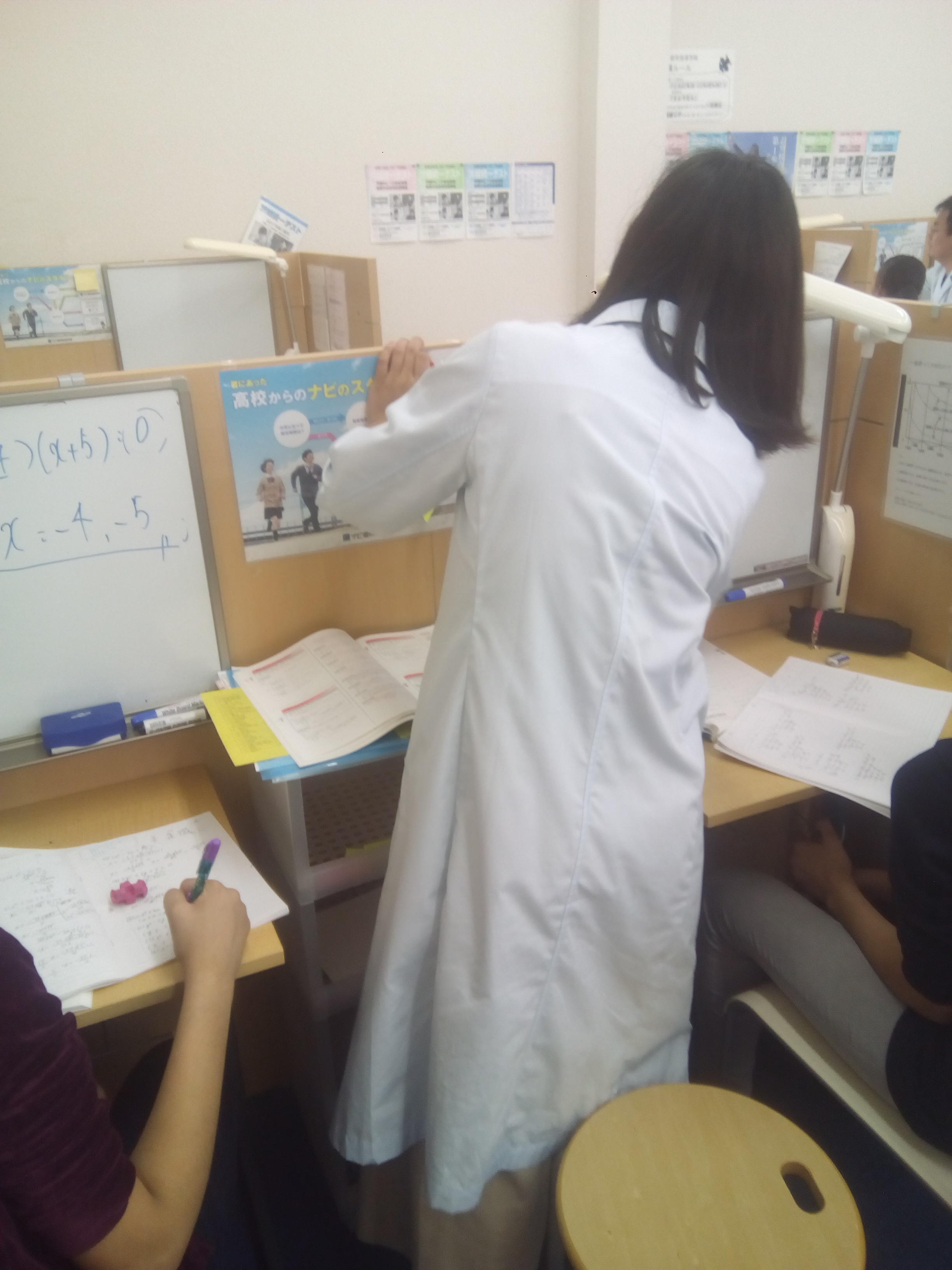 ナビ個別指導学院の授業は、個別の席ごとに設置された自分専用のホワイトボードで解き方や考え方を一緒に確認、それから生徒が問題を解くという「個別授業」スタイルです。