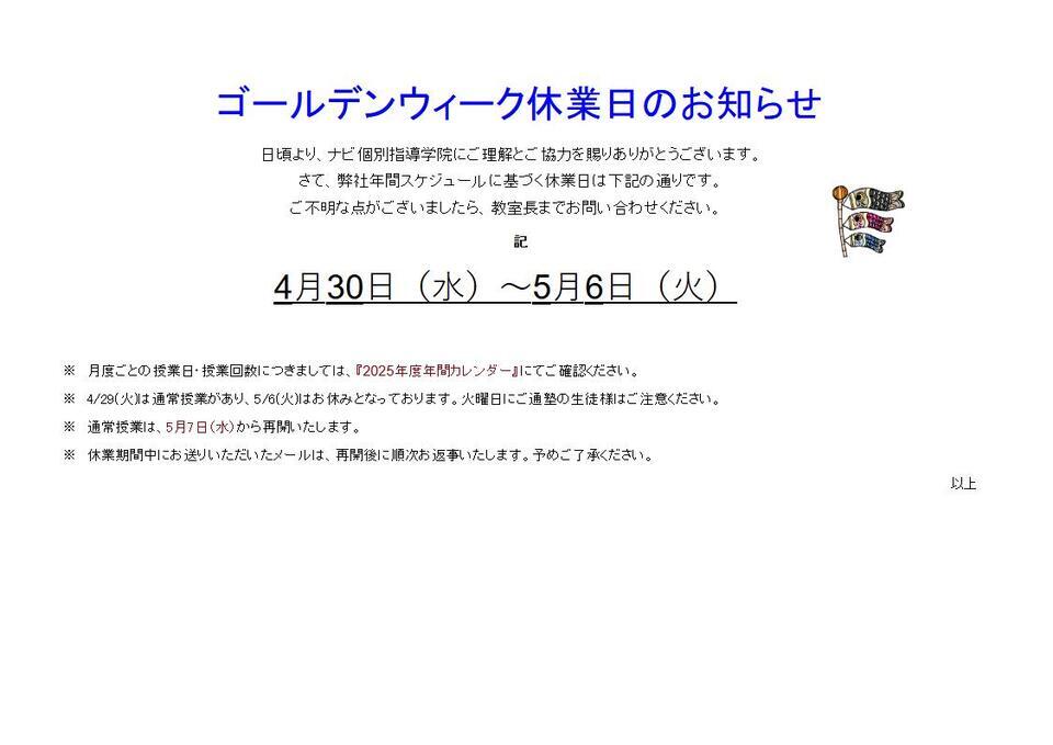 GW休業日 4月30日(水)~5月6日(火)