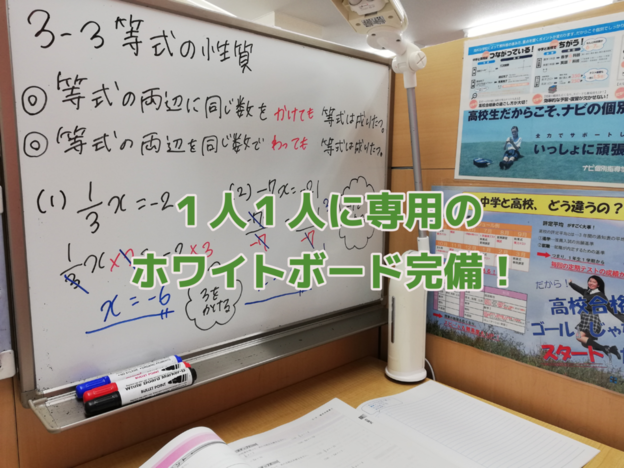 ナビ個別指導学院の授業は、個別の席ごとに設置された自分専用のホワイトボードで解き方や考え方を一緒に確認、それから生徒が問題を解くという「個別授業」スタイルです。