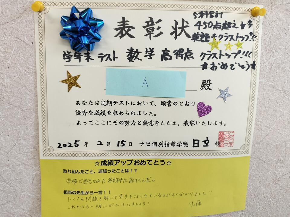 今回は学年末テストで好成績を残してくれた生徒のご紹介です!!