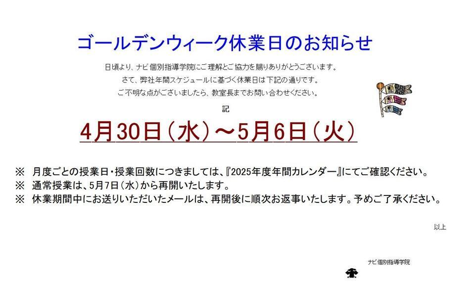 日頃より、ナビ個別指導学院にご理解とご協力を賜りありがとうございます。