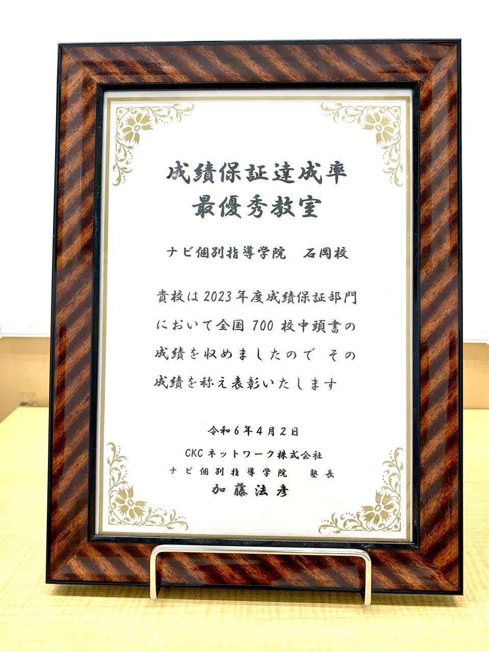 ナビ個別指導学院 石岡校が2023年度成績保証達成率・達成者数において全国で最優秀教室として表彰されました。